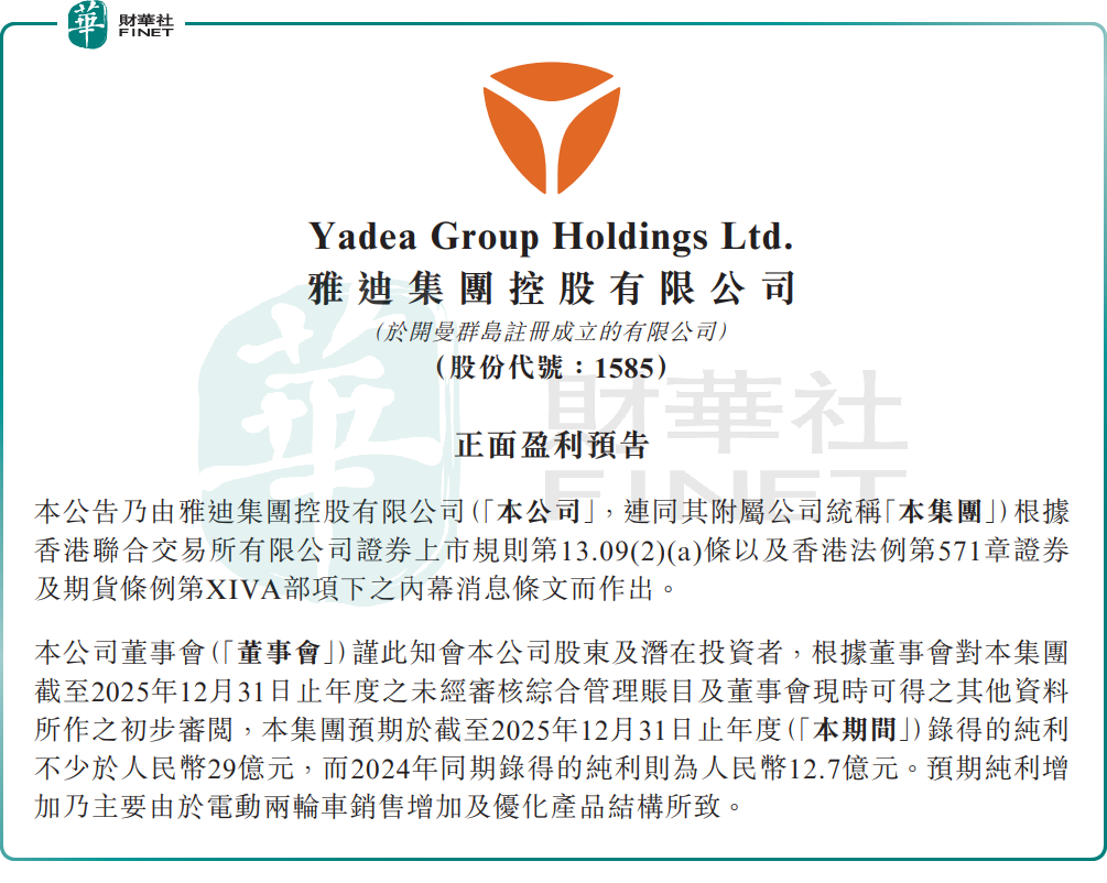 公告显示,雅迪控股预期2025年录得的纯利不少于29亿元(单位人民币,下同),而2024年同期录得的纯利则为12.7亿元,同比增长约1.28倍。
