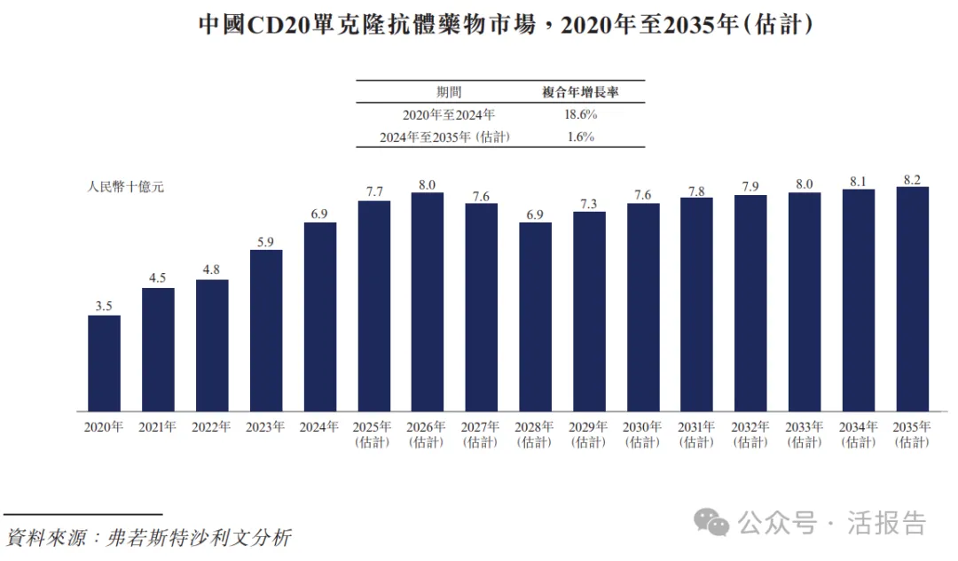 中国CD20单克隆抗体药物市场规模从2020年的人民币35亿元增长至2024年的人民币69亿元,期间复合年增长率为18.6%,预计于2035年达到人民币82亿元。