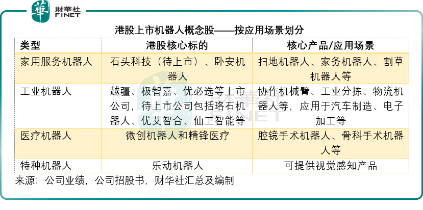 3)医疗机器人:聚焦精准医疗场景,辅助或替代人工完成手术、康复等医疗操作的高精度设备,代表公司包括微创机器人(02252.HK)和精锋医疗(02675.HK),可提供腔镜手术机器人、骨科手术机器人、血管介入手术机器人等,应用于外科手术和术后康复。