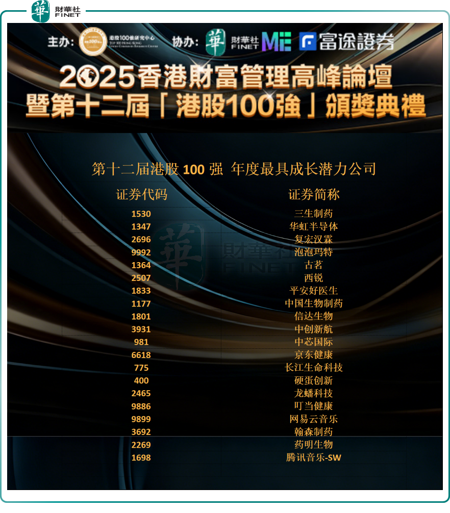 在第十二届港股100强评选上,港股100强研究中心坚守专业、公正、客观原则,聚焦新经济、新赛道,重磅发布“年度最具成长潜力公司”榜单。