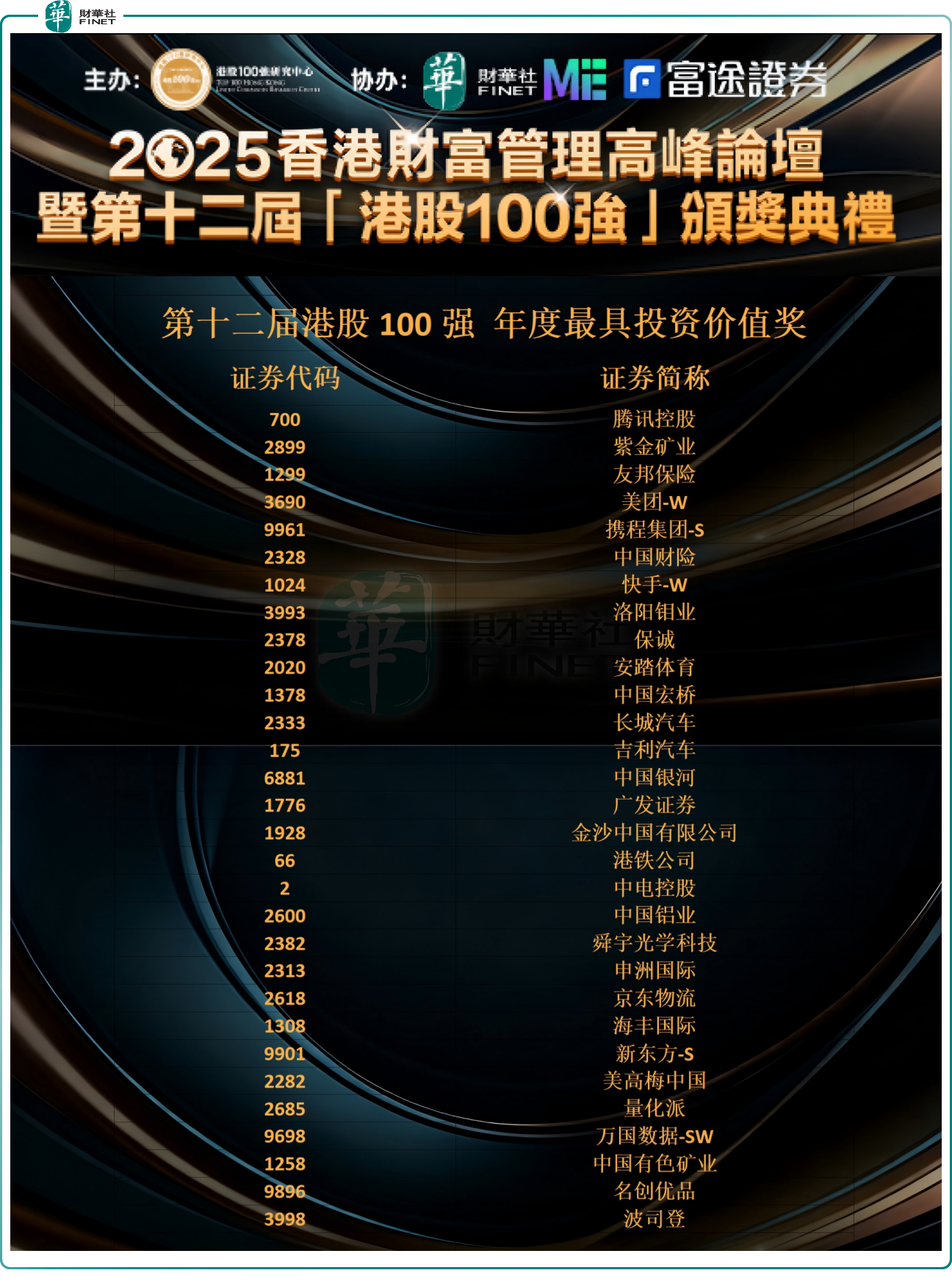 面对充满挑战与机遇的资本市场环境,港股100强研究中心推出了具备长期投资价值的榜单"年度最具投资价值奖"。
