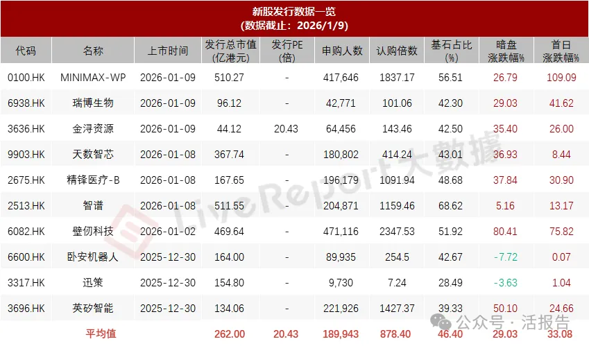 据LiveReport大数据,近10家上市新股平均发行市值为262.00亿,最大市值为MINIMAX-WP,最小市值为金浔资源;平均发行PE为20.43倍,多家PE为负值,无参考意义;平均申购人数为189,943人,平均认购倍数为878.40倍;平均基石占比为46.40%,基石平均比例大幅上升;