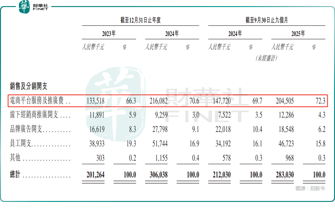 而从细项来看,电商平台服务及推广费是销售及分销开支中的主要组成部分。2023年、2024年及2025年前三季度,电商平台服务及推广费的占比分别为66.3%、70.6%和72.3%,这也表明爷爷的农场对于电商平台的流量比较依赖。