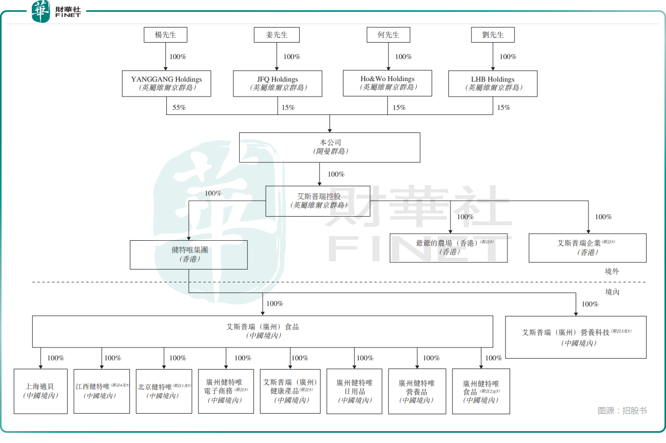 爷爷的农场采用“开曼控股-境外子公司-境内运营实体”的离岸架构,其发展历史可追溯至2015年。彼时,杨钢、姜福全、何建农、刘海波四位创始人就在广州共同设立广州健特唯日用品有限公司,正式启动业务运营。