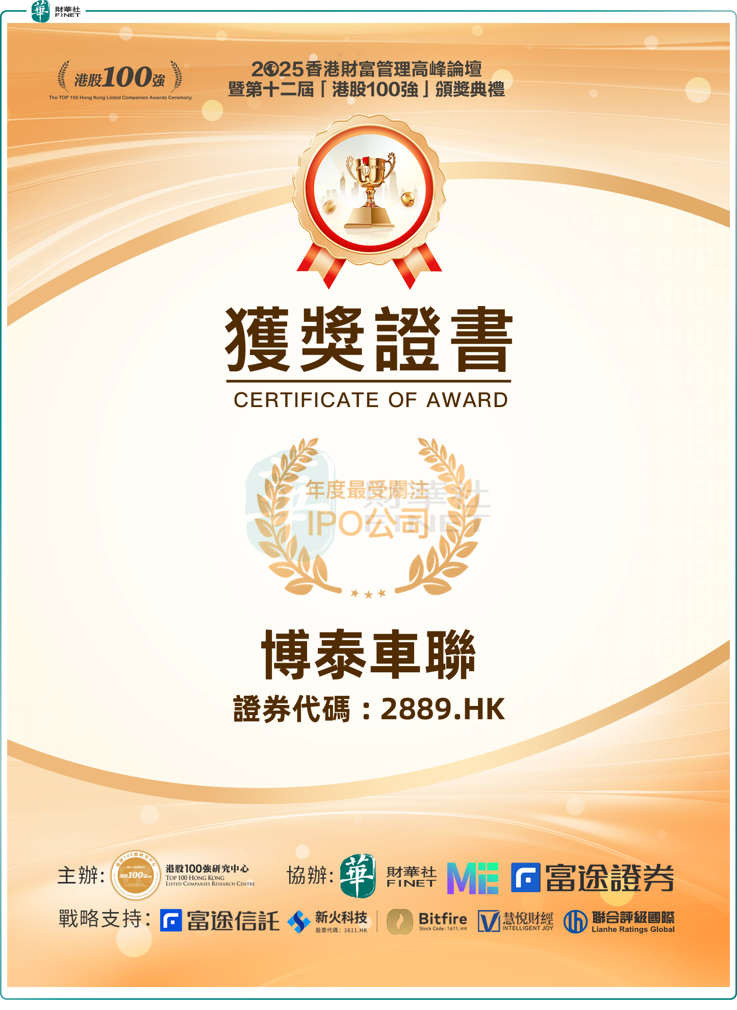 2026年1月9日,由港股100强研究中心主办,财华社、ME、富途证券联合协办的“2025香港财富管理高峰论坛暨第十二届港股100强颁奖典礼”在香港会展中心盛大启幕。