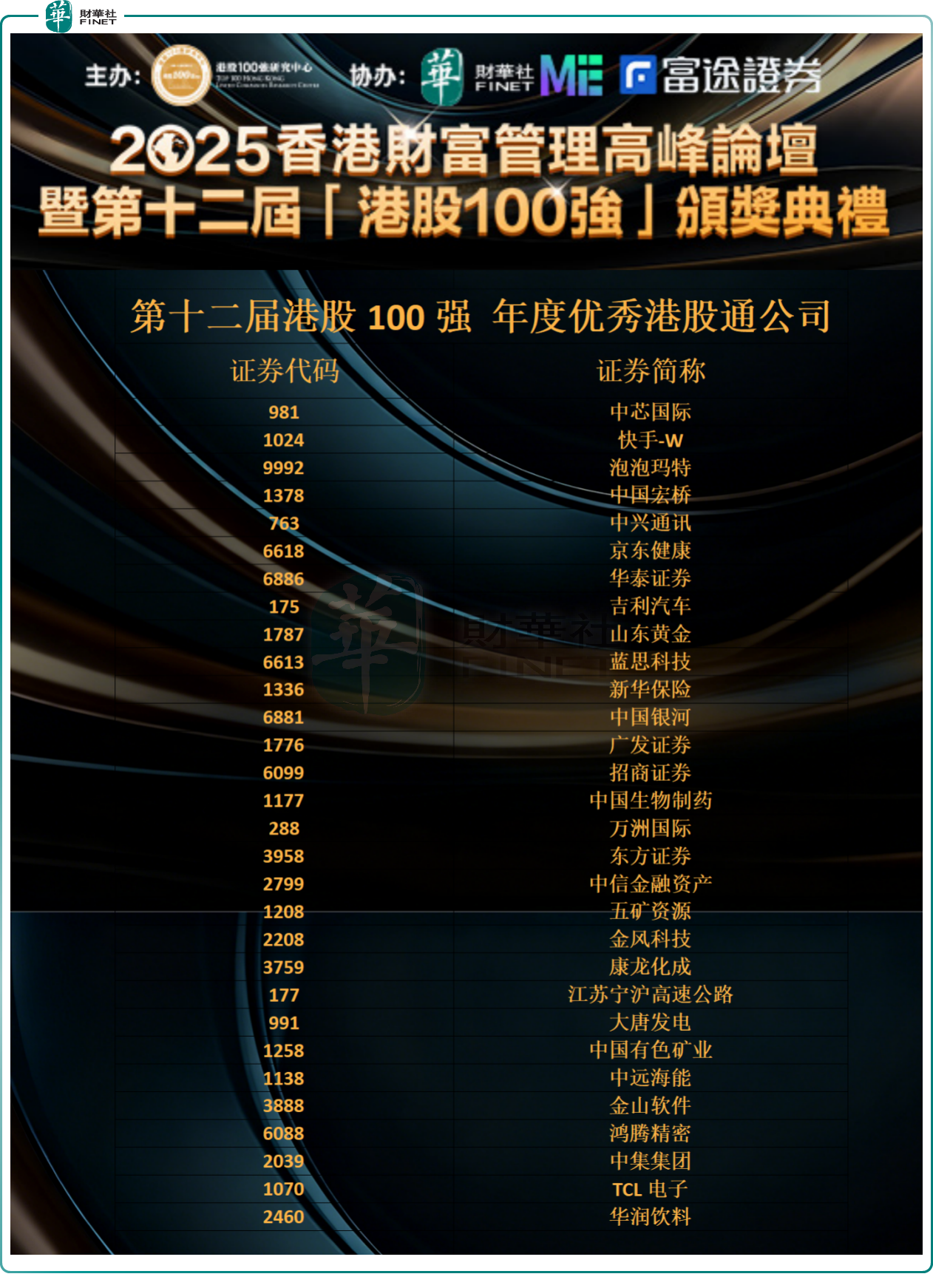 以下是第十二届港股100强“年度优秀港股通公司”榜单获奖企业名单(30名):