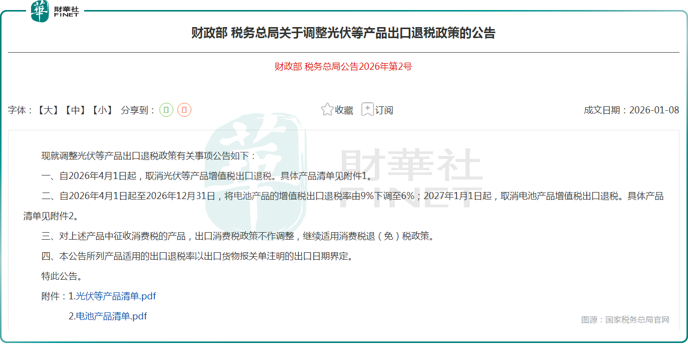 除了上述消息外,1月8日,财政部、税务总局联合发布公告,明确自2026年4月1日起,取消光伏组件、硅片等产品增值税出口退税。