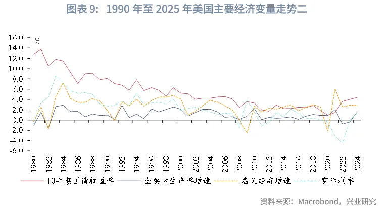 具体来看,在2009年至2014年,美联储通过三轮量化宽松和零利率政策大幅压低收益率曲线。长期利率在此期间持续下行,并于2012年7月降至约1.5%。随着经济复苏,长期利率在2013年升至2%以上,并在QE退出预期驱动下于2013年底升至约3%。2014年,受通胀预期持续走弱、期限溢价收窄等影响,长期利率再度回落至约2 %。同一时期,3个月期国债收益率长期徘徊在零附近,全要素生产率增速亦接近零。可见当时美国名义增长更多依赖货币化刺激,而非生产率改善。