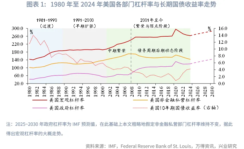 本文将美国主导的全球第三轮债务周期划分为以下四个阶段:1980年至1990年(新旧周期过渡阶段)、1991年至2000年(早期扩张阶段)、2001年至今(繁荣与顶点阶段)。基于Dalio对当前债务周期的判断,我们可将2001年至2008年划分为中期繁荣阶段,其主要特征是信贷扩张加速与资产价格泡沫的同步上升。2008年金融危机至今,进入债务周期的“后期动态(late-cycle dynamics)”阶段。这一阶段的核心特征在于去杠杆与再杠杆并存、货币政策边际效力下降,财政与货币政策一体化,以及高债务、高通胀与社会分裂并行,债务周期已逐渐逼近顶点。因此,本文将2001年至今的繁荣与顶点进一步划分为两个小节进行讨论:其一为“中期繁荣阶段”,其二“后期动态阶段”。
