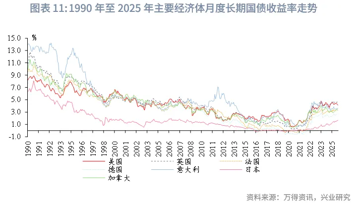 1980年代中后期,在通胀预期锚定后,美国长期利率中枢开始下移;相比之下,德国因市场深度与流动性不及美国、期限溢价更高,其长期利率略高于美国。法国、加拿大、意大利与英国的长期利率则普遍高于德国,反映出各自通胀预期与财政状况的差异。这种“美国为全球锚、德国为欧洲锚”的格局一直延续到1990年代欧元体系逐步成形。在欧盟框架确立后,欧洲内部利差收敛,全球利率体系的层级结构被重新塑造。