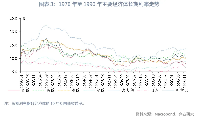 具体来看,本轮周期的“早期扩张”阶段利率呈现高位震荡式下行。主要发达经济体在20世纪70年代普遍经历高利率、高波动的利率环境,政策利率虽自历史高位逐步回落,但下行过程中伴随明显的剧烈波动。各国长期利率的标准差普遍超过1%,显示出显著的不确定性。该阶段的核心特征在于,政策推动下的通胀预期逐步被重新锚定,为随后债务周期的扩张奠定了通胀回落和货币稳定的基础。