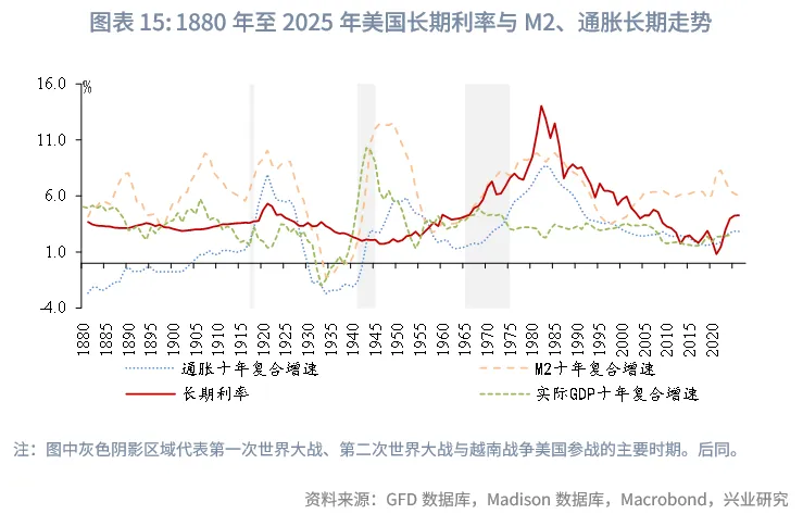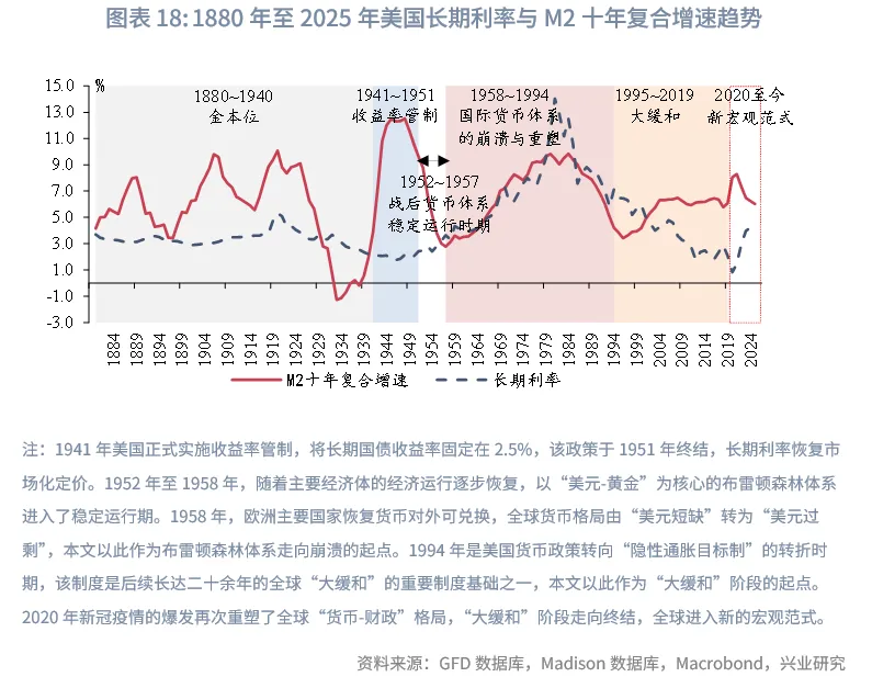 从历史视角看,货币增速与长期利率的关系并不稳定,其联动性随全球货币制度的更迭而呈现出鲜明的阶段性特征。1940年以前,主要经济体皆为金本位制,货币供给主要取决于黄金储备变化,而长期利率则由通胀与实际利率决定。二者的决定机制关联性较弱,进而导致相关性整体较弱。1941年至1951年,美国政府实施收益率管制,将名义长期利率锁定在低位,而战时财政扩张又推高了货币增速,造成了货币数量与利率完全脱节的极端情形。随后美国退出收益率管制,货币增速也显著下降。