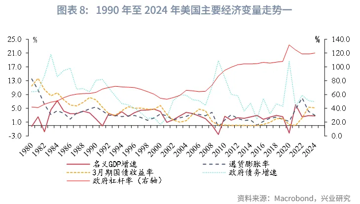 从更长历史视角来看,此轮美国非金融私营部门杠杆率的上升幅度与上一轮相当,若将金融衍生品对应的规模计入,则总体杠杆水平更高[2],但这场危机并未演化为大萧条。危机爆发后,私营部门杠杆率并未出现大幅去化,反而在短暂调整后维持高位,杠杆主要从非金融私营部门转移至政府部门,发生的是杠杆的转移而非去化,这是与1929年大萧条之后存在的较大不同。本轮危机中政策反应更快、力度更强,且财政与货币的协同机制得到充分发挥,从而有效阻断了典型的费雪式“债务—通缩”螺旋的形成(Almunia et al., 2010)。此后,债务周期由“中期繁荣”进入“后期动态(late-cycle dynamics)”阶段——经济增长逐渐依赖政策支撑与资产泡沫延展,形成以政策维持的“高杠杆稳态”。