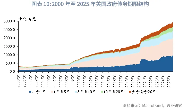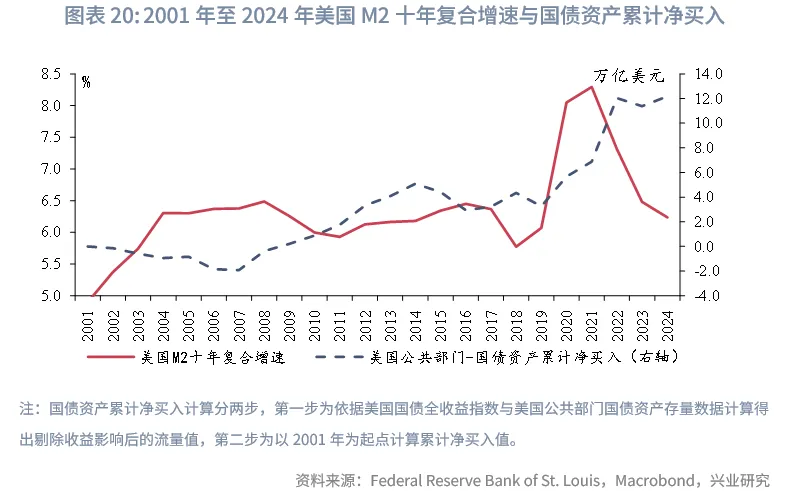 第三轮债务周期开启后,长债利率开启漫长下行,直至2020年10年美债利率最低逼近0.5%后开启反弹,此后最高触及 5%。整体来看,疫情后美国劳动年龄人口增速虽短暂回升,但主要依赖移民拉动,而在当前右翼力量上升、移民政策趋紧的大环境下,这一支撑难以持续。在这种低潜在增长与弱人口结构背景下,目前推升长期利率的核心压力主要来自另一端:自2000年以来货币增速长期快于产出增速,形成了持续性的货币超发力量。