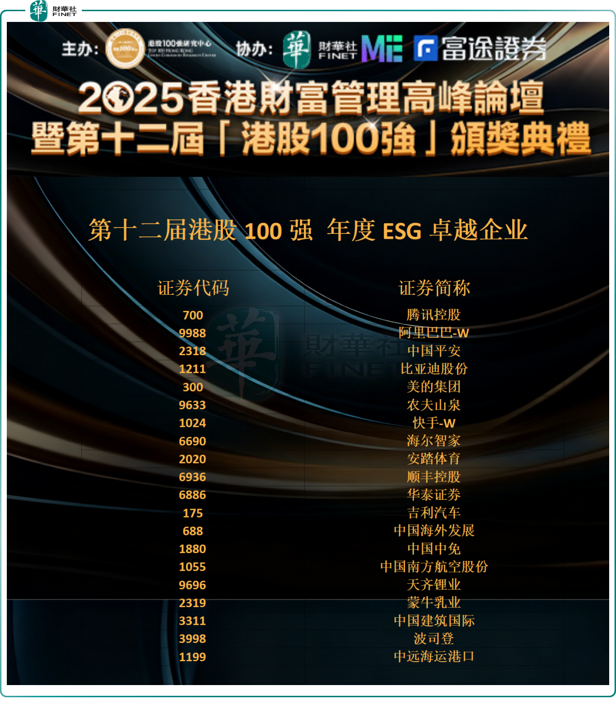 以下是第十二届港股100强“年度ESG卓越企业”榜单获奖企业名单(20名):