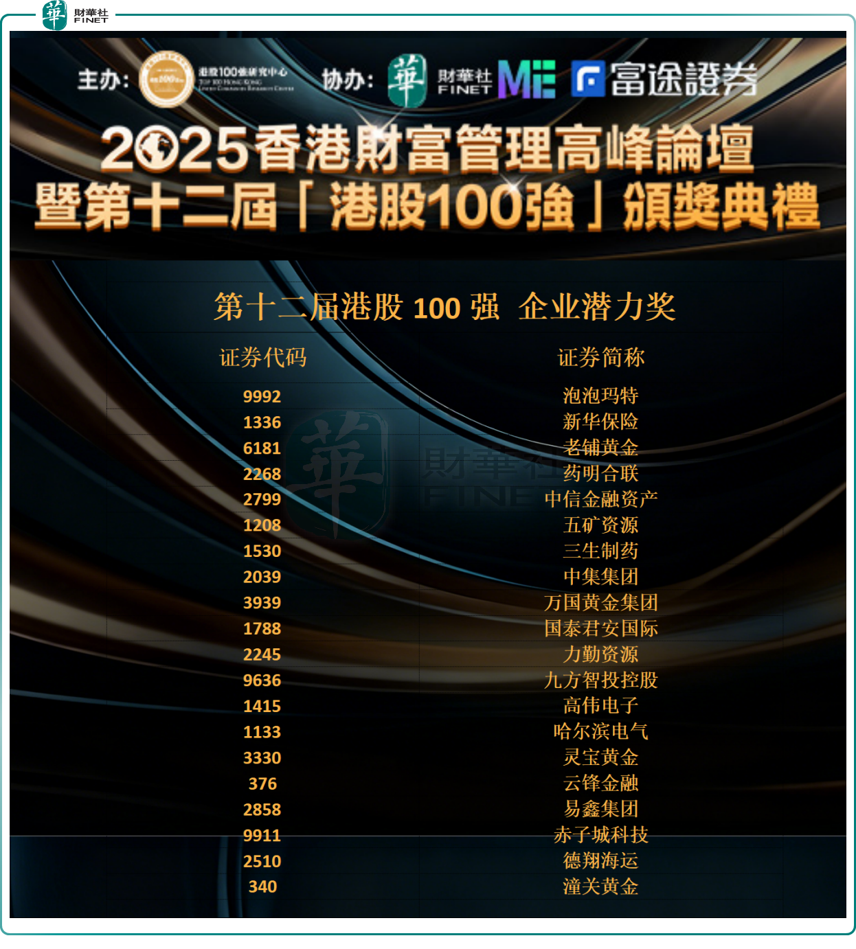 “港股100强”子榜单“企业潜力奖”,以市值、税后净利润为核心准入门槛,结合企业成长韧性、创新能力等多维度,经严谨评估与专业遴选,最终遴选出兼具强劲增长动能与卓越市场表现的港股上市企业。