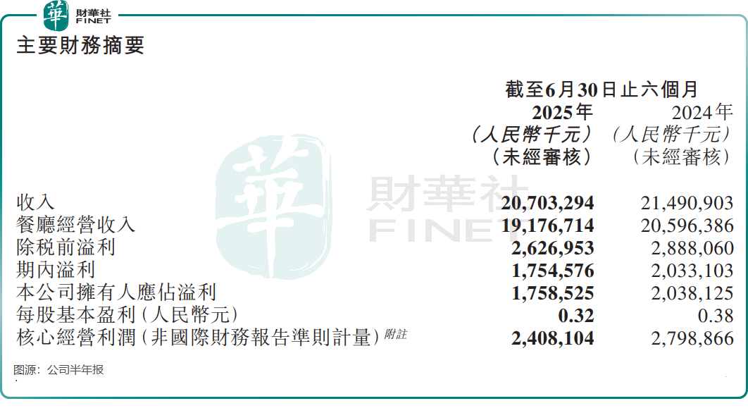 从经营数据来看,海底捞已陷入明显的增长停滞。2025年上半年财报显示,公司实现营收207.03亿元(单位人民币,下同),同比下降3.7%;核心经营利润24.08亿元,同比下降14.0%。公司拥有人应占溢利17.59亿元,同比下滑13.7%。