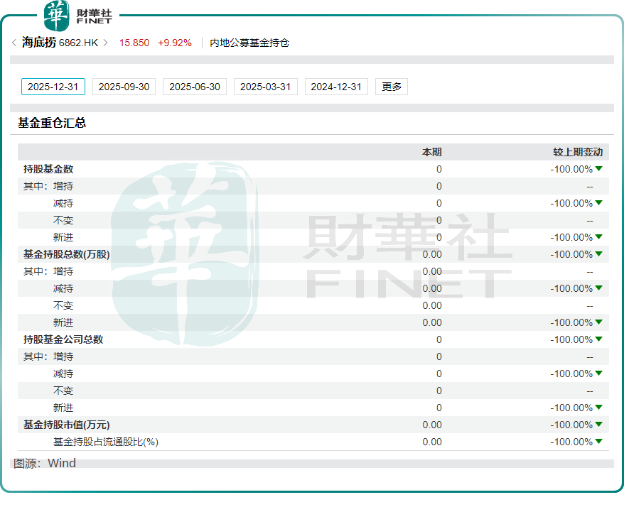 雪上加霜的是,资本市场信心持续流失。截至2026年1月13日收盘,海底捞股价较五年前的历史高点已暴跌超过80%。机构投资者也在撤离,Wind数据显示,2025年末重仓海底捞的内地公募基金数量从2024年末的25只锐减至0只。高盛和摩根大通等知名机构相继退出,市场忧虑情绪浓厚。