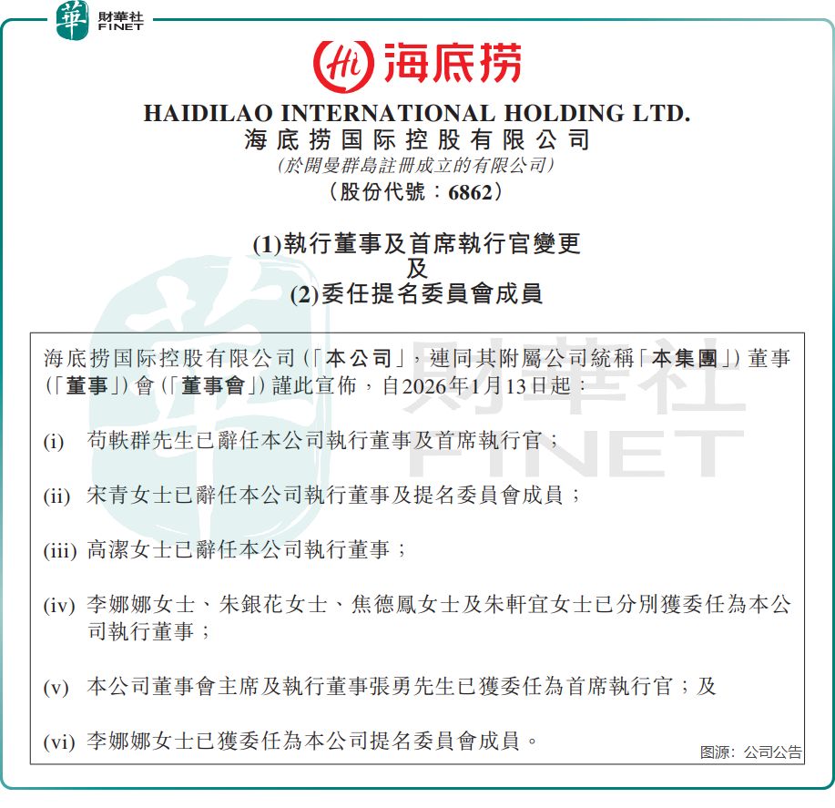 1月13日晚,海底捞的董事会变动公告引发市场高度关注。公告显示,苟轶群辞任公司执行董事及首席执行官(CEO),董事会主席兼执行董事张勇获委任为新任CEO。这意味着,这位将海底捞从一家小店打造成餐饮巨舰的创始人,在交出执行权四年后,再度回归一线,亲自操盘。