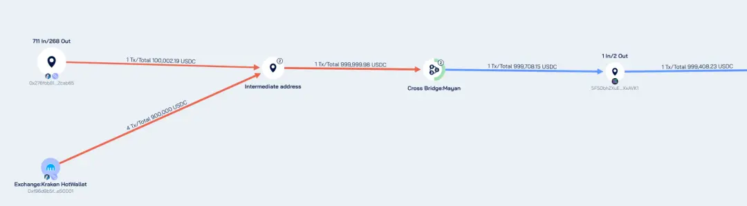 对上述的跨链资金进行进一步的追踪可以发现,该资金来源于Arbitrum地址0xBc985b167C5F3801B19E2Dec7082c2fcbBF07e91,继续往前追溯发现这笔资金90%提取自Kraken,10%来自一个未知的多链活跃交易地址0x276fbb81c8a7567ad2412469a549bd4dc82cab65。