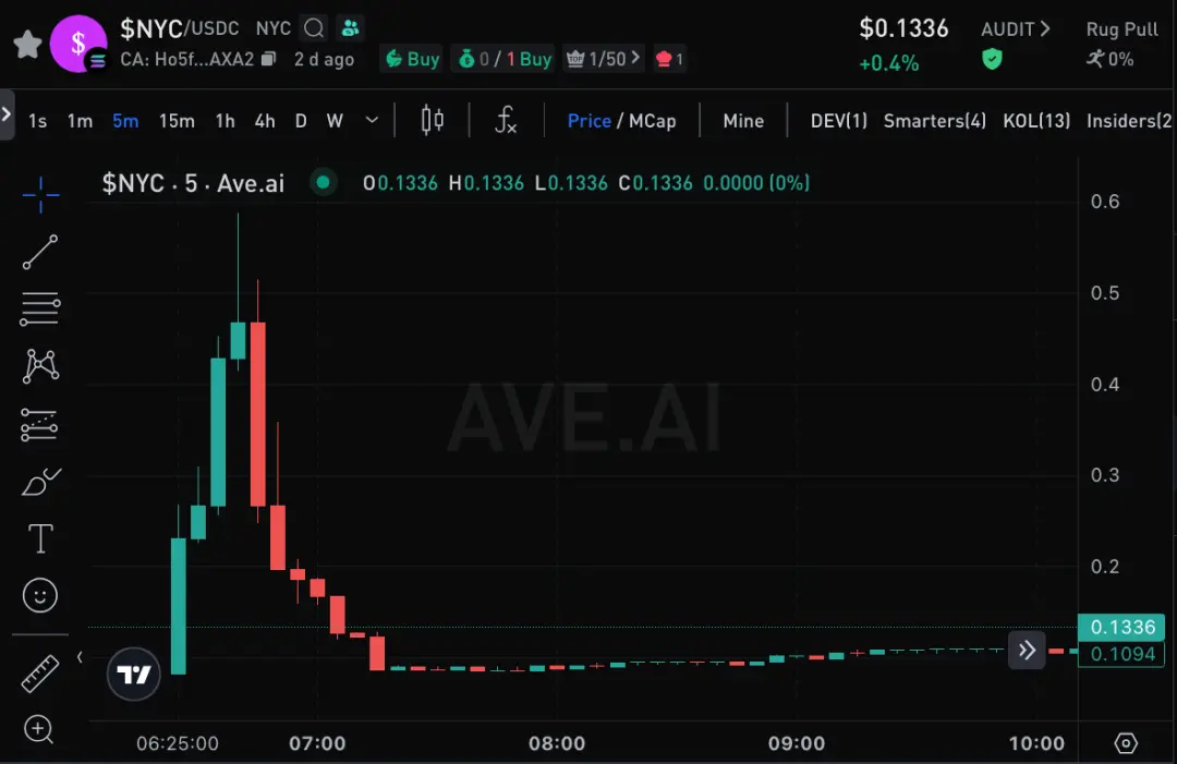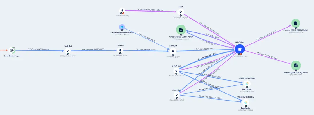 地址9Ty4M从Mayan跨链桥和Kraken用户地址获取了1,000,001 USDC,随后创建了NYC-USDC的流动性池。在北京时间1月13日6:43移除流动性导致价格暴跌后,地址9Ty4M从当天16:15开始持续小额买入NYC代币,持续到现在。