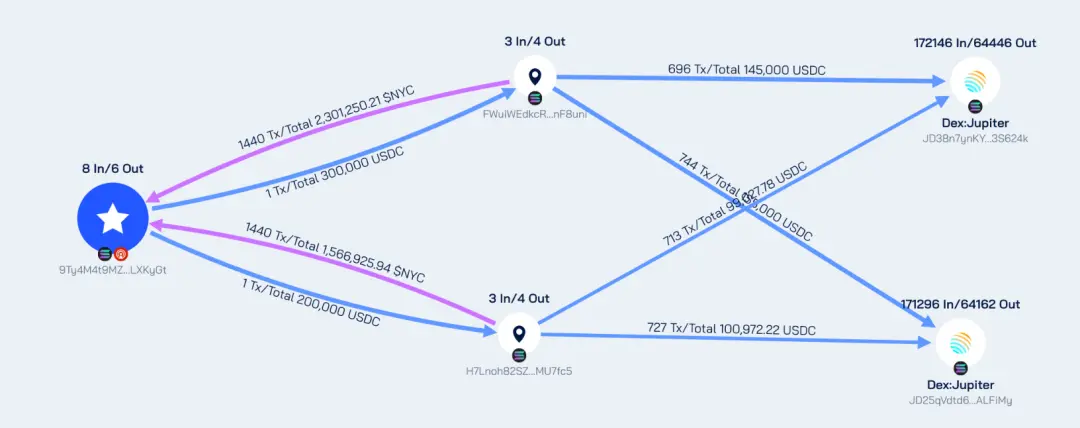 通过BeosinTrace的数据统计,目前地址9Ty4M已通过地址FWuiWEdkcR1NLPjozcEuErtGGDZG5kyPu3oszmnF8uni和地址H7Lnoh82SZghsXmoqffoCiFz7U3D1cwZ8ZPjRUMU7fc5分别在Jupiter买入2,301,250和1,566,926枚NYC代币,但NYC价格仅回到0.133-0.134,总市值约为1.3亿美元。
