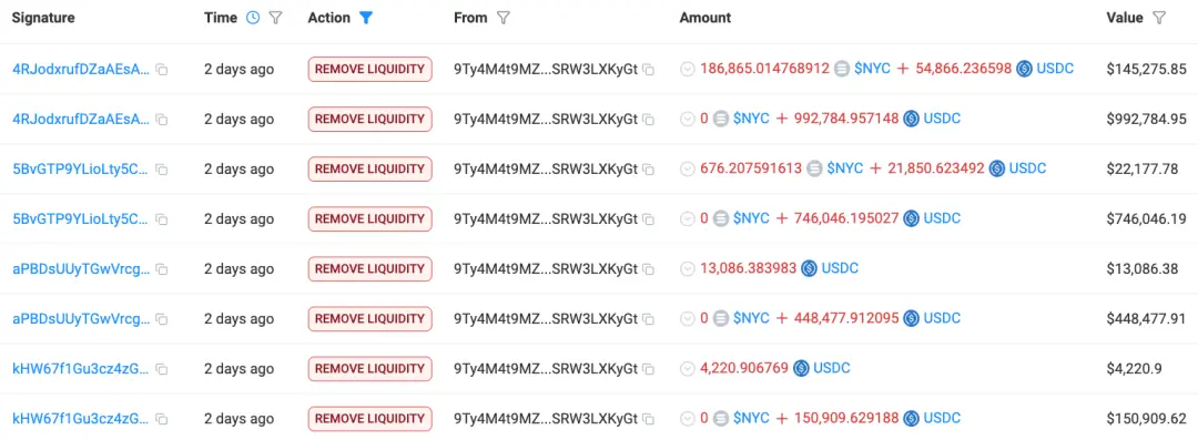 该地址共移除了约2,377,376USDC,导致NYC代币价格下跌超过80%,市值从最高的6亿美元缩水至不足1亿美元。