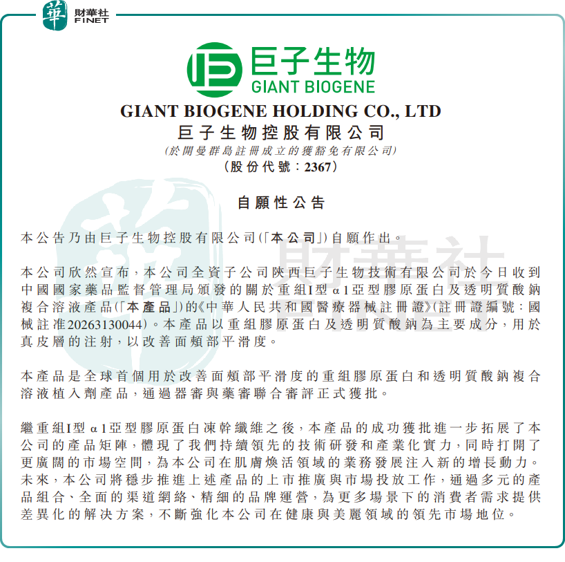 巨子生物表示,本产品获批,是继重组I型α1亚型胶原蛋白冻干纤维之后的又一重要突破,进一步拓展了公司的产品矩阵,体现了集团持续领先的技术研发和产业化实力,同时打开了更广阔的市场空间,为公司在肌肤焕活领域的业务发展注入新的增长动力。