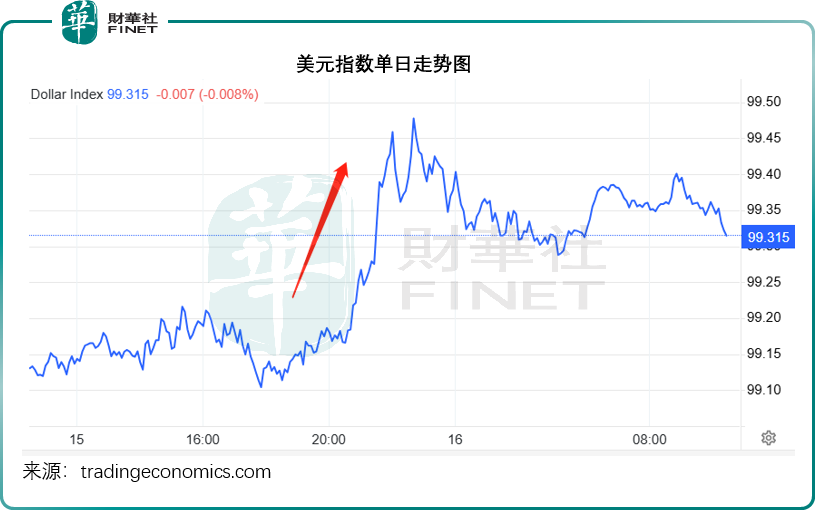 受此推动,美元指数走强,见下图,美元指数99.1水平上升至99.3,并保持。