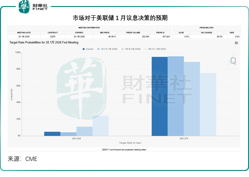 这反映美国经济表现强劲,市场进一步确认了美联储于2026年1月28日议息期间维持利率不变的预期,维持联邦基金利率于3.50%-3.75%水平的预期比例从一周前的88.9%上升至当前的95.0%,见下图。