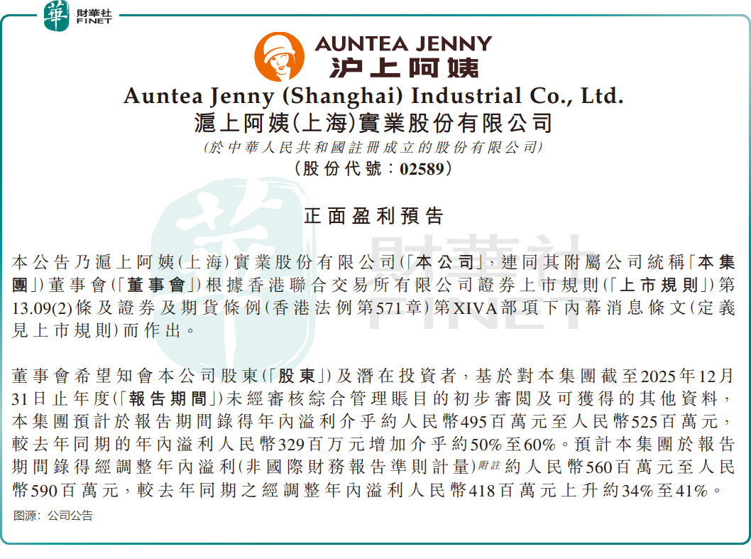 根据沪上阿姨发布的业绩预告,公司预计2025年度实现净利润4.95亿元(单位:人民币,下同)至5.25亿元,同比增长50%至60%,全年预计增速较上半年已实现的增速(20.9%)大幅提升,显示出强劲的增长势头。