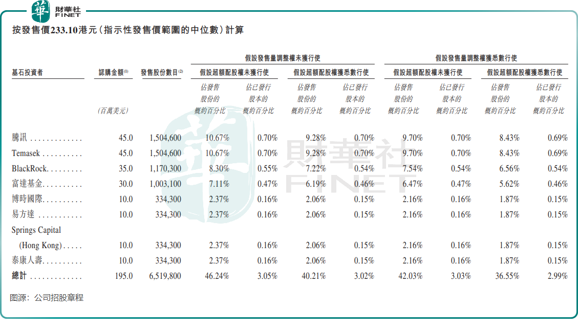 鸣鸣很忙本次发行已获得多家豪华基石投资者的支持,包括腾讯(00700.HK)、淡马锡、贝莱德、富达基金、易方达、泰康人寿等。基石投资者已同意在满足相关条件的前提下,按发售价认购合计约1.95亿美元(约15.2亿港元)的发售股份。