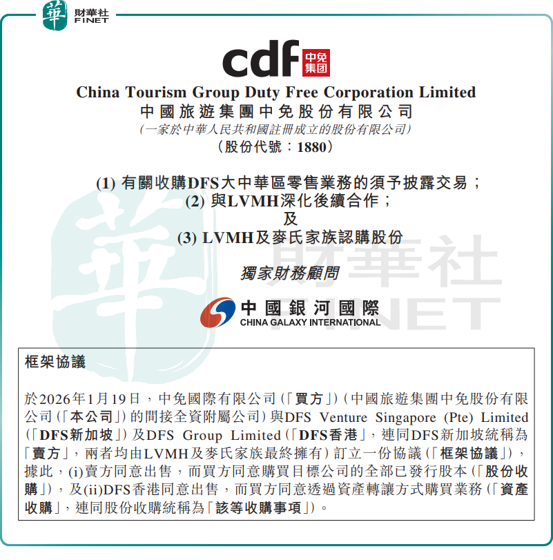 公告称,1月19日,中国中免与法国LVMH 集团及DFS联合创始人暨股东Robert Miller先生共同拥有的全球高端旅游零售标杆企业DFS集团联合宣布,中国中免不超过3.95亿美元收购DFS在香港及澳门的旅游零售业务以及其在大中华区的无形资产。同时,引入 LVMH 集团及 Robert Miller先生作为中国中免的H股股东,H股每股认购价为77.21港元(较19日收盘价折让11.66%),总认购金额不超过9.24亿港元。此外,还与LVMH集团签署战略合作备忘录。