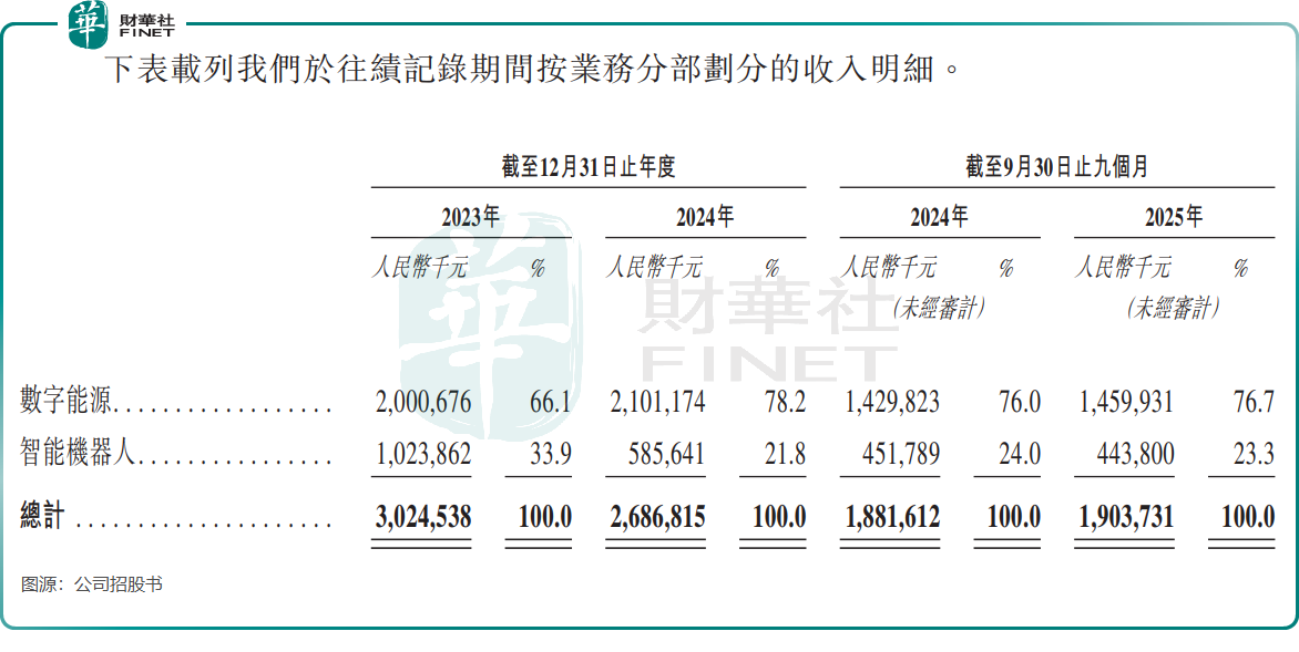但细分业务表现却冷热不均。数字能源业务作为压舱石,2024年收入21.01亿元,占总收入比重达78.2%,2025年前三季度收入14.6亿元,保持稳健增长;而智能机器人业务则逆势收缩,2024年收入5.86亿元,同比大幅下滑42.8%,2025年前三季度收入4.44亿元,同比仍录得下滑。