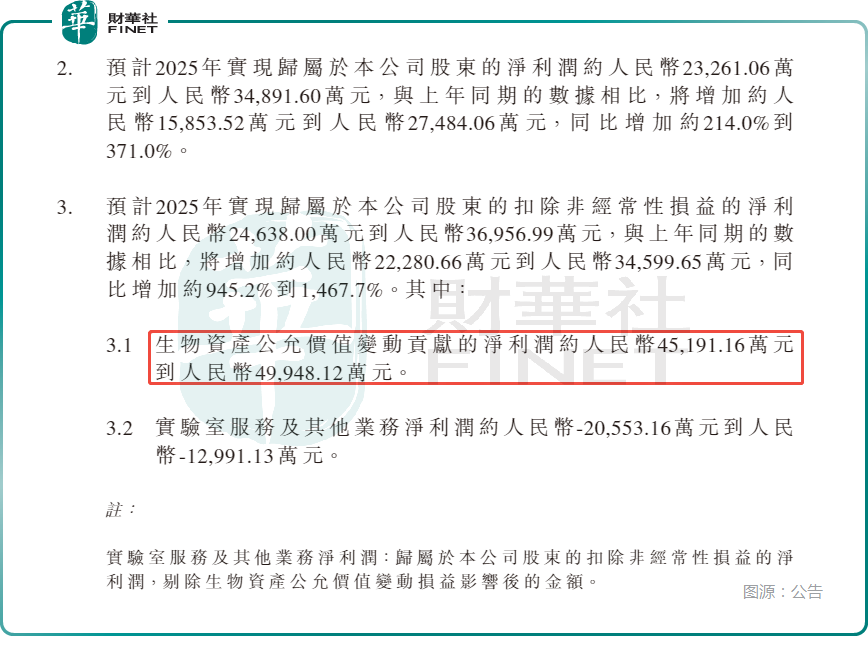 其中:生物资产公允价值变动贡献净利润约4.52亿元至4.99亿元;实验室服务及其他业务净利润约为-2.06亿元至-1.30亿元(剔除生物资产公允价值变动损益后)。