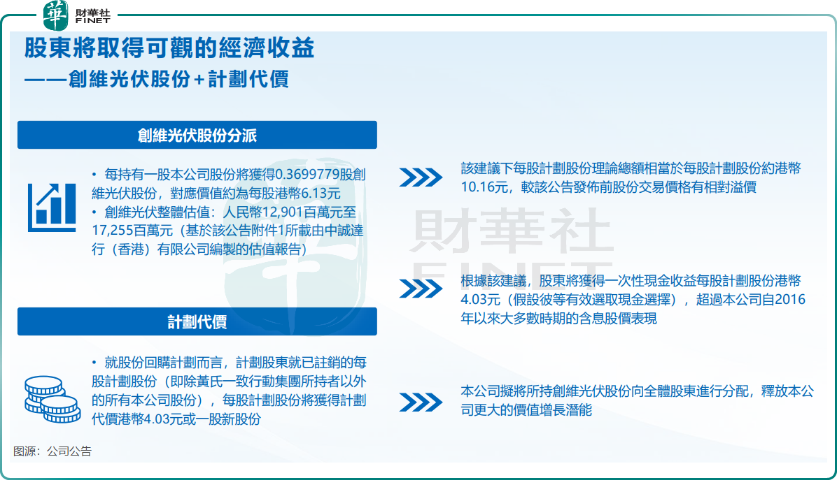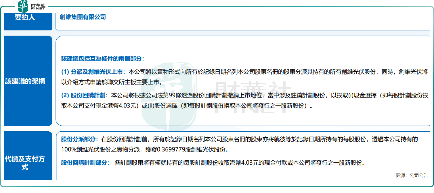 根据公告,公司具体方案分两步走。一方面,公司计划以介绍方式将旗下光伏业务在联交所主板独立上市,并向全体现有股东按持股比例分派光伏业务股份。测算显示,每股创维股份可获发约0.37股光伏股份,按行业估值测算理论价值约6.13港元。另一方面,集团将实施私有化退市,股东每股可选择获得4.03港元现金,或1股私有化后的新公司股份。