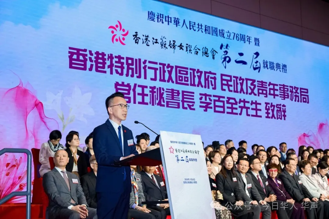香港特别行政区政府民政及青年事务局常任秘书长李百全在致辞中,高度肯定了妇女总会成立以来在凝聚在港江苏妇女、推动两地交流合作及服务社群方面的丰硕成果。他结合习近平主席在全球妇女峰会上的倡议,指出特区政府将通过举办第二届香港家庭暨妇女发展高峰会,持续推动香港妇女事业高质量发展,并鼓励与会嘉宾把握国家发展机遇,发挥香港独特优势,为社会进步贡献力量。