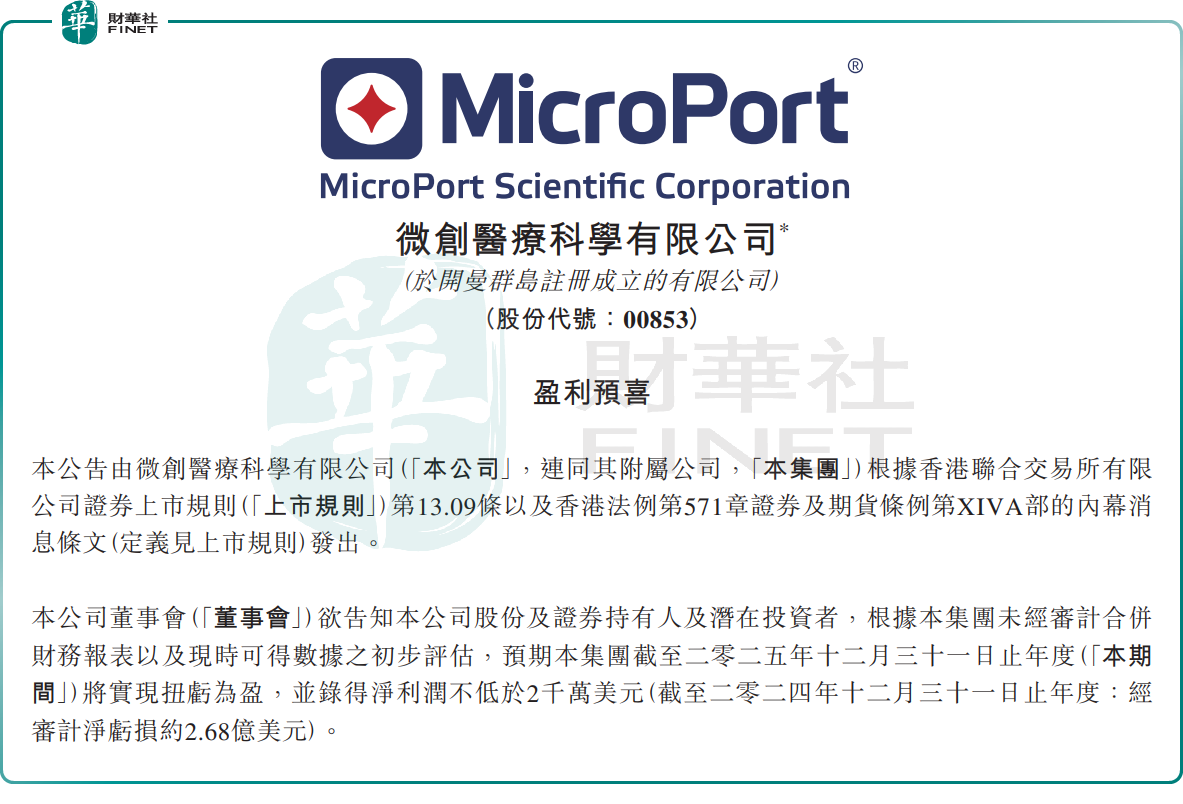 1月22日,微创医疗发布盈利预喜公告,预计2025年将实现扭亏为盈,录得净利润不低于2000万美元,2024年则净亏损约2.68亿美元。