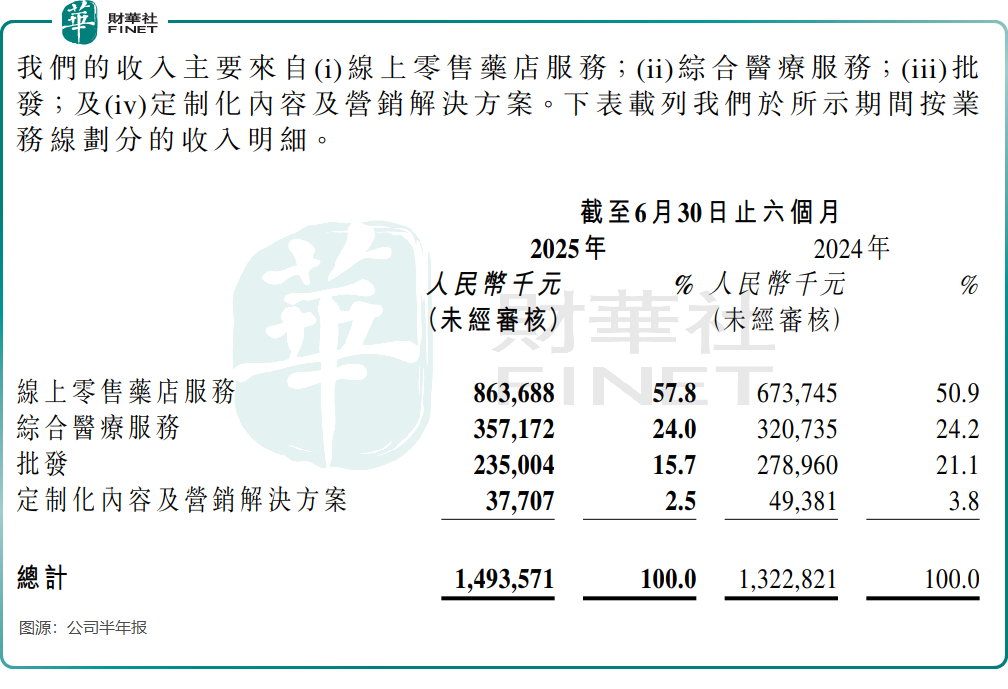 公司增长主要来自面向消费者的业务分部,具体即线上零售药店服务与综合医疗服务。其中,线上零售药店服务(即“卖药”)是其收入增长的绝对主力,2025年上半年,该业务收入同比大增28.2%,占总收入比重从上年同期的50.9%提升至57.8%,表明公司对“卖药”业务的依赖性持续加深。