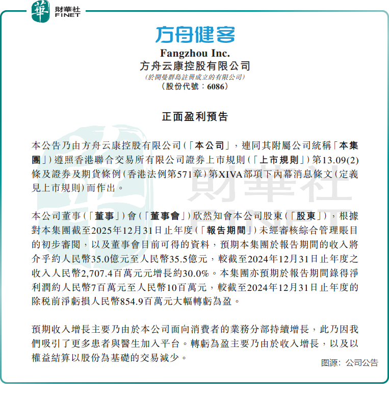 根据公司最新业绩预告,方舟健客预计2025年全年收入约35亿元至35.5亿元(单位人民币,下同),同比增长约30%,增速较2025年中期12.9%的同比增幅明显加快。