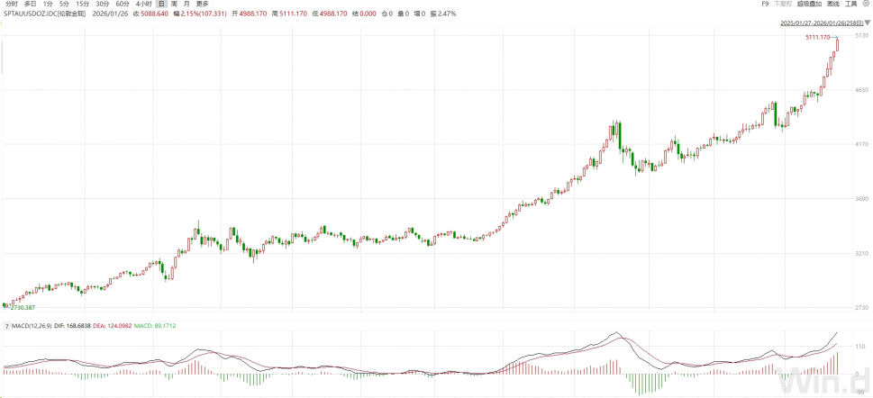 1月26日,现货黄金再创历史新高,并在盘中站上5100美元/盎司,日内上涨超过110美元,涨幅逾2%。黄金在短短一个月内,已从4365美元上涨至5100美元,期间累计涨幅超过16%,呈现加速上涨的趋势。