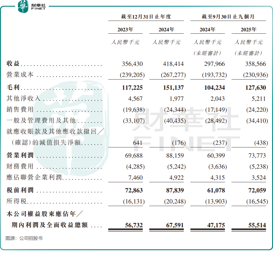 招股书数据显示,莲池医院的业绩保持着稳步增长的态势。2023年至2024年,公司收入从3.56亿元(单位人民币,下同)增至4.18亿元,净利润从5673.2万元增至6759.1万元;2025年前三季度,收入进一步增至3.59亿元,净利润亦进一步提升至5551.4万元。