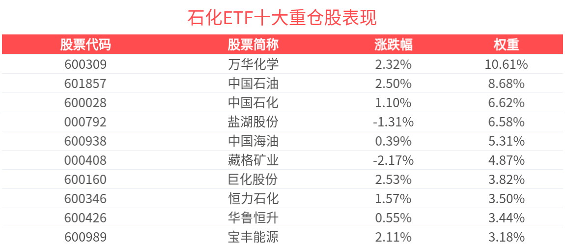 石化ETF紧密跟踪中证石化产业指数,数据显示,截至2025年12月31日,中证石化产业指数前十大权重股分别为万华化学、中国石油、中国石化、盐湖股份、中国海油、藏格矿业、巨化股份、恒力石化、华鲁恒升、宝丰能源,前十大权重股合计占比56.73%。