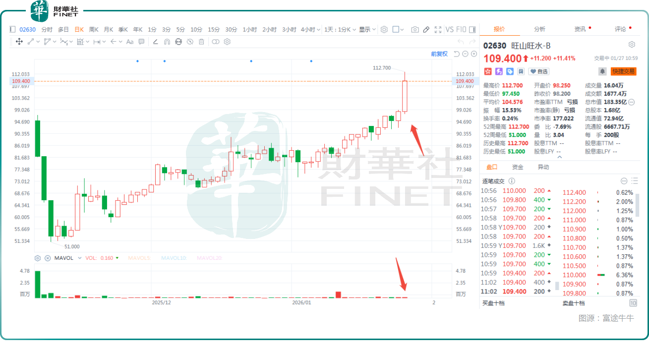 数据显示,1月27日,旺山旺水的股价大涨创下上市新高,截至发稿时间涨逾11%。