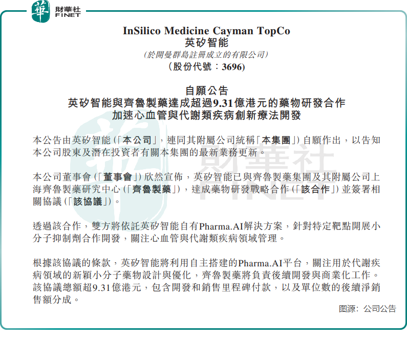 公司宣布与国内制药龙头齐鲁制药达成研发合作,双方将依托英矽智能的Pharma.AI平台,聚焦心血管与代谢疾病领域的小分子抑制剂开发。该协议总额超过9.31亿港元,包含开发、销售里程碑付款以及后续的净销售额分成。