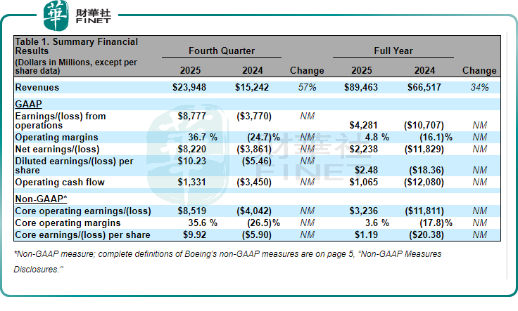具体而言,2025年,波音在收入、交付量、订单量及现金流等多个核心运营指标上实现显著改善,全年与第四季度均呈现强劲的回暖势头。