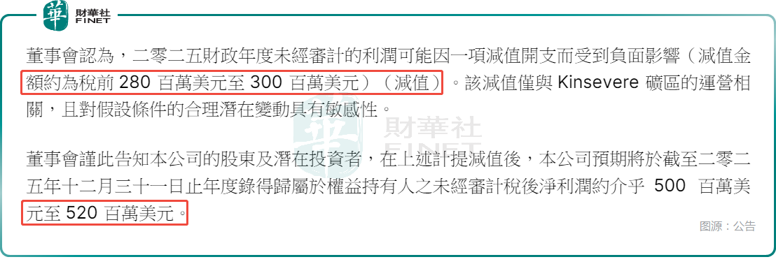 公告显示,五矿资源董事会认为,2025财年(年结日为12月31日)未经审计的利润可能因一项减值开支而受到负面影响(减值金额约为税前2.8亿美元至3.0亿美元)(减值)。该减值仅与Kinsevere矿区的运营相关,且对假设条件的合理潜在变动具有敏感性。