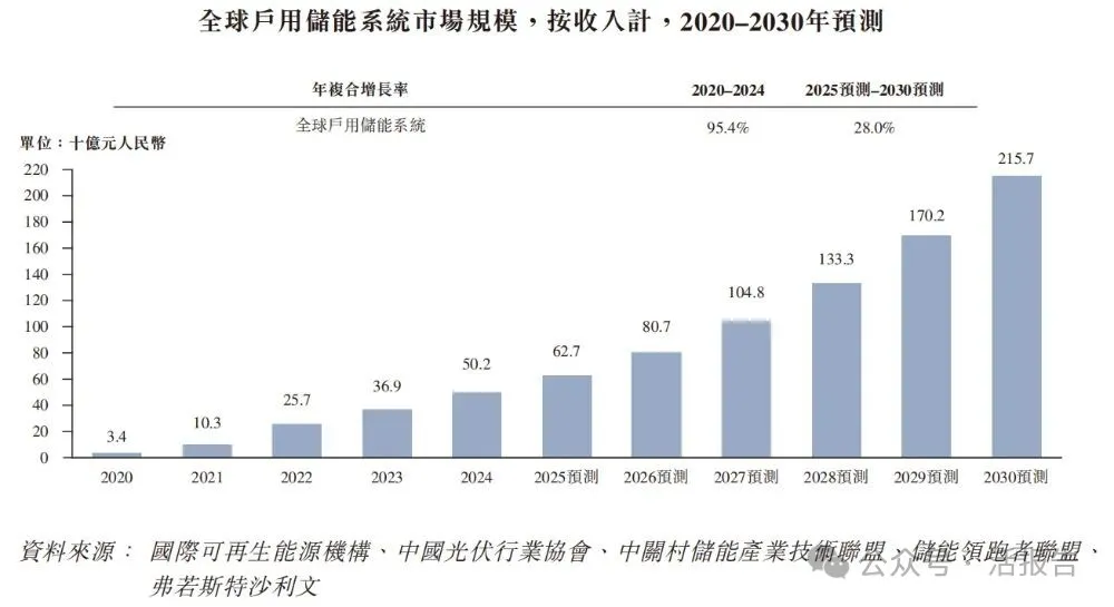 根据弗若斯特沙利文(Frost & Sullivan)的报告,全球户用储能系统市场的市场规模由2020年的34亿元人民币增至2024年的502亿元人民币,复合年增长率达95.4%。预计市场规模将持续扩大,从2025年的627亿元人民币增长至2030年的2,157亿元人民币,对应复合年增长率为28.0%。