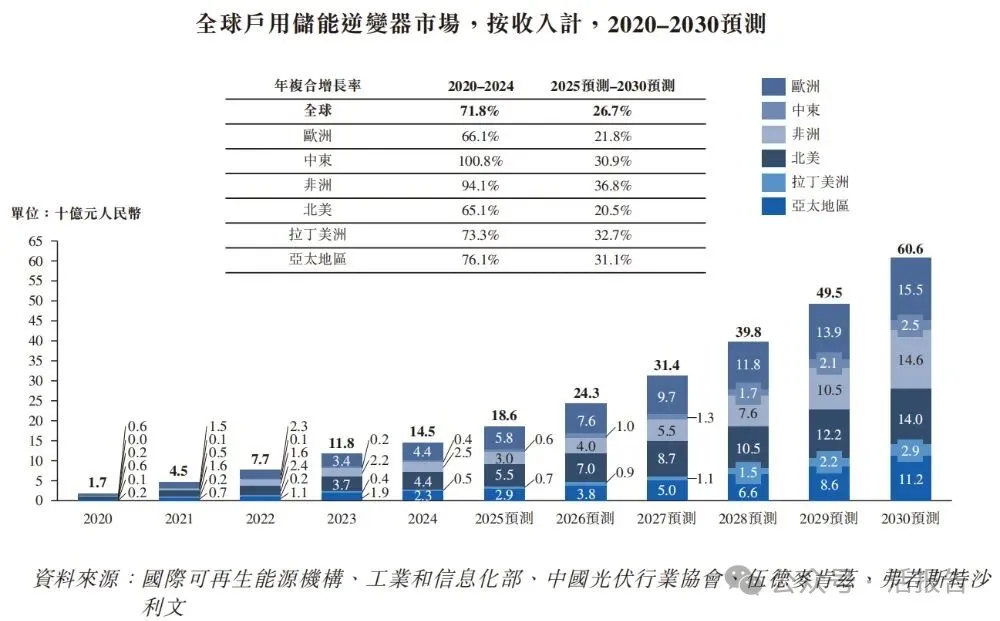 根据弗若斯特沙利文(Frost & Sullivan)的报告,全球户用储能逆变器市场规模将由2020年的人民币17亿元增长至2024年的人民币145亿元,复合年增长率达71.8%。预计市场规模将由2025年的人民币186亿元持续增长至2030年的人民币606亿元,对应复合年增长率为26.7%。