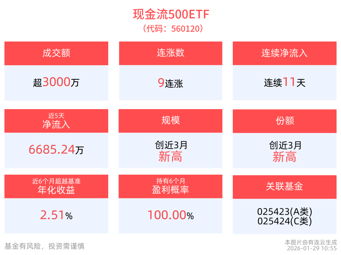 截至2026年1月29日10:55,中证500自由现金流指数强势上涨1.44%,成分股白银有色上涨8.54%,吉比特上涨6.87%,鄂尔多斯上涨4.68%,欧派家居,浙江龙盛等个股跟涨。现金流500ETF(560120)上涨0.47%, 冲击9连涨。流动性方面,现金流500ETF盘中换手20.75%,市场交投活跃。从资金净流入方面来看,现金流500ETF近11天获得连续资金净流入,合计“吸金”9462.96万元。
